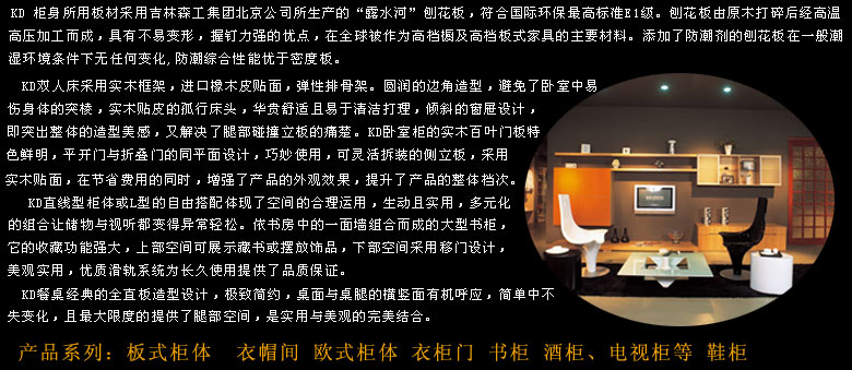 由美國KD Home Product Inc. 在中國投資設(shè)立的獨資企業(yè)--凱蒂(北京)家具有限公司,作為KD整體家居系統(tǒng)在中國的生產(chǎn)商和提供者,秉承KD公司以設(shè)計開發(fā)為基礎(chǔ)的一貫理念,整合公司的設(shè)計、生產(chǎn)、開發(fā)、配飾等多種資源,依據(jù)客戶的風(fēng)格定位及個人喜好,給客戶提供一體化的整體家居解決方案,通過材料的運用、色彩的搭配、產(chǎn)品的訂制、家具的擺放,實現(xiàn)客戶個性、和諧、優(yōu)雅的整體家居設(shè)計理念。